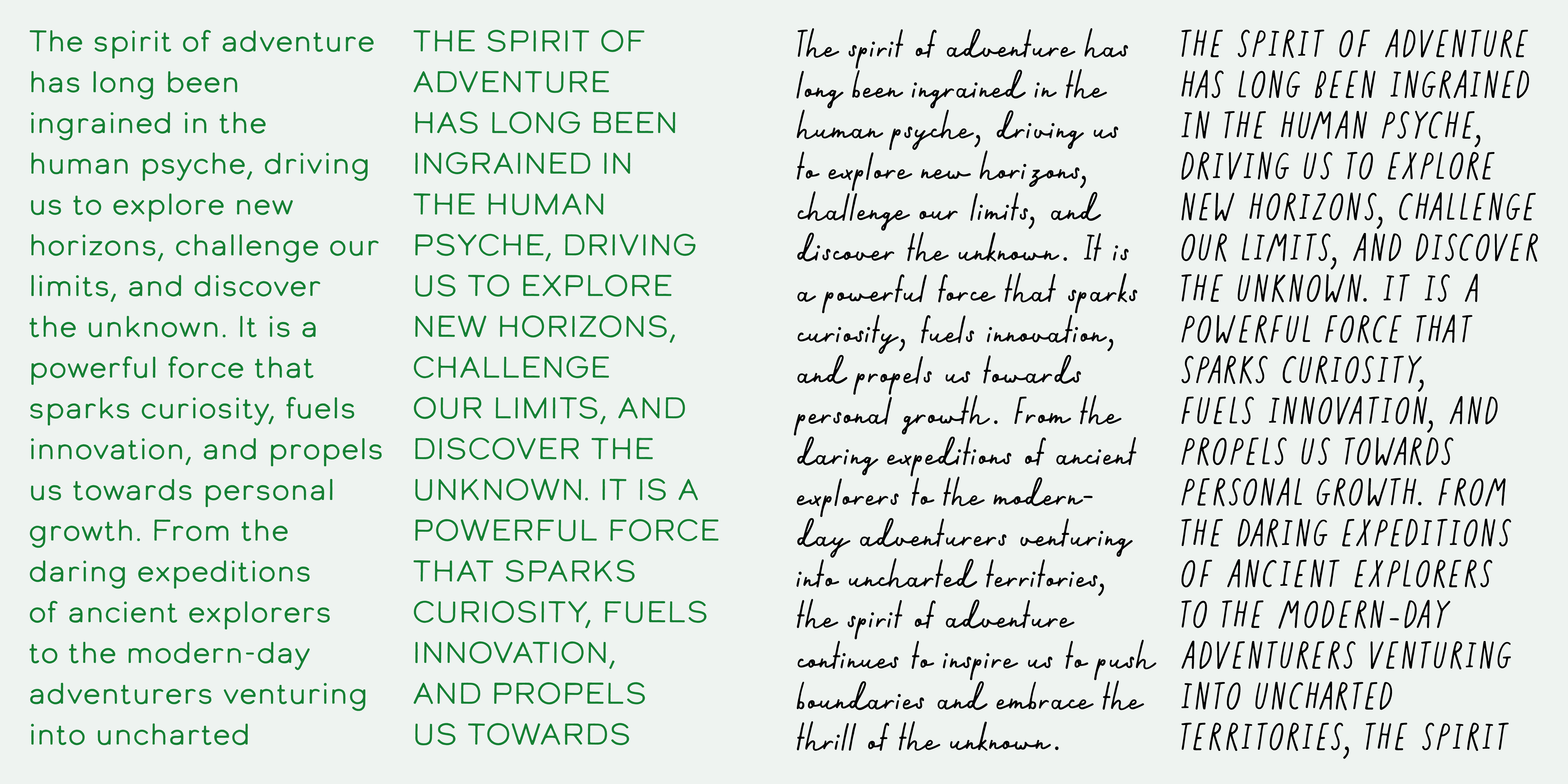 Calder is a display typeface collection. It incorporates 10 styles and offers two distinctive voices: a playful semi-connected script and a selection of subtle yet authentic sans serifs. Designed to complement each other, they offer a unique and engaging visual tool. Calder Script, Calder LC and Calder LC Grit, are available in both Upper and Lower case, whilst the rest of the collection is available uniquely in Upper case. Inspired by the pursuit of the outdoors, Calder began as a personal experience and endeavour to express and share the spirit of adventure connected with this renewed, growing movement.