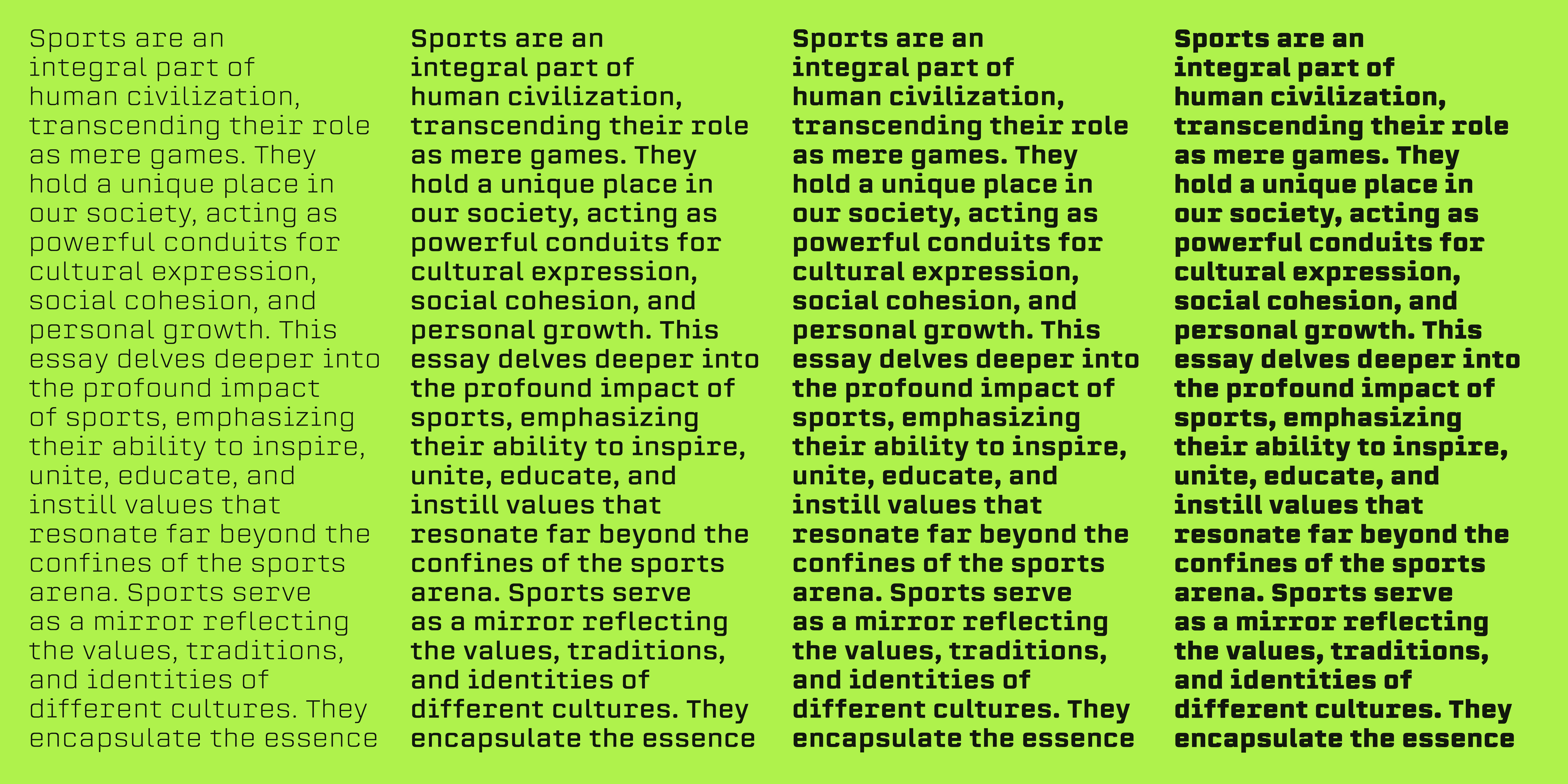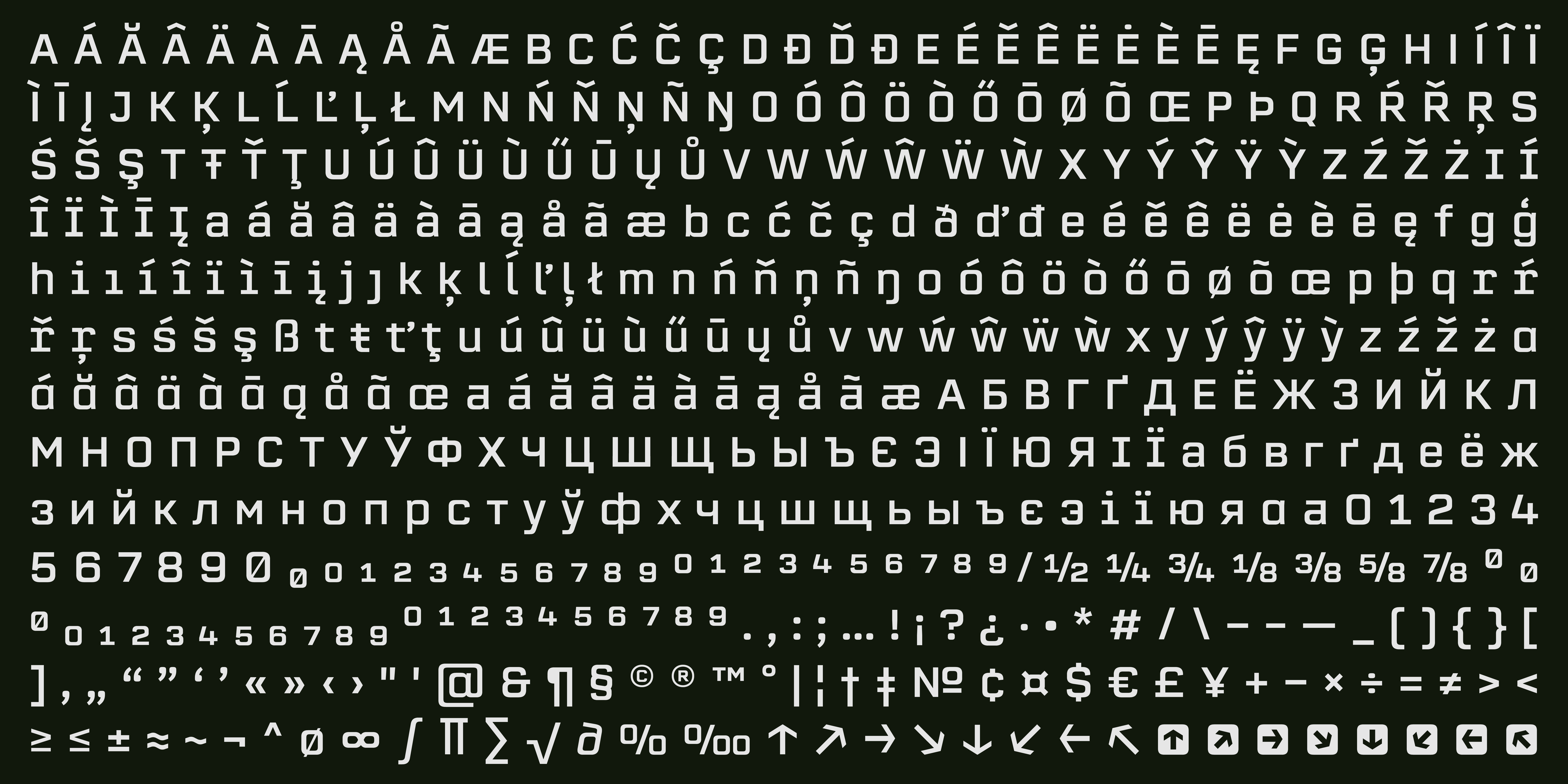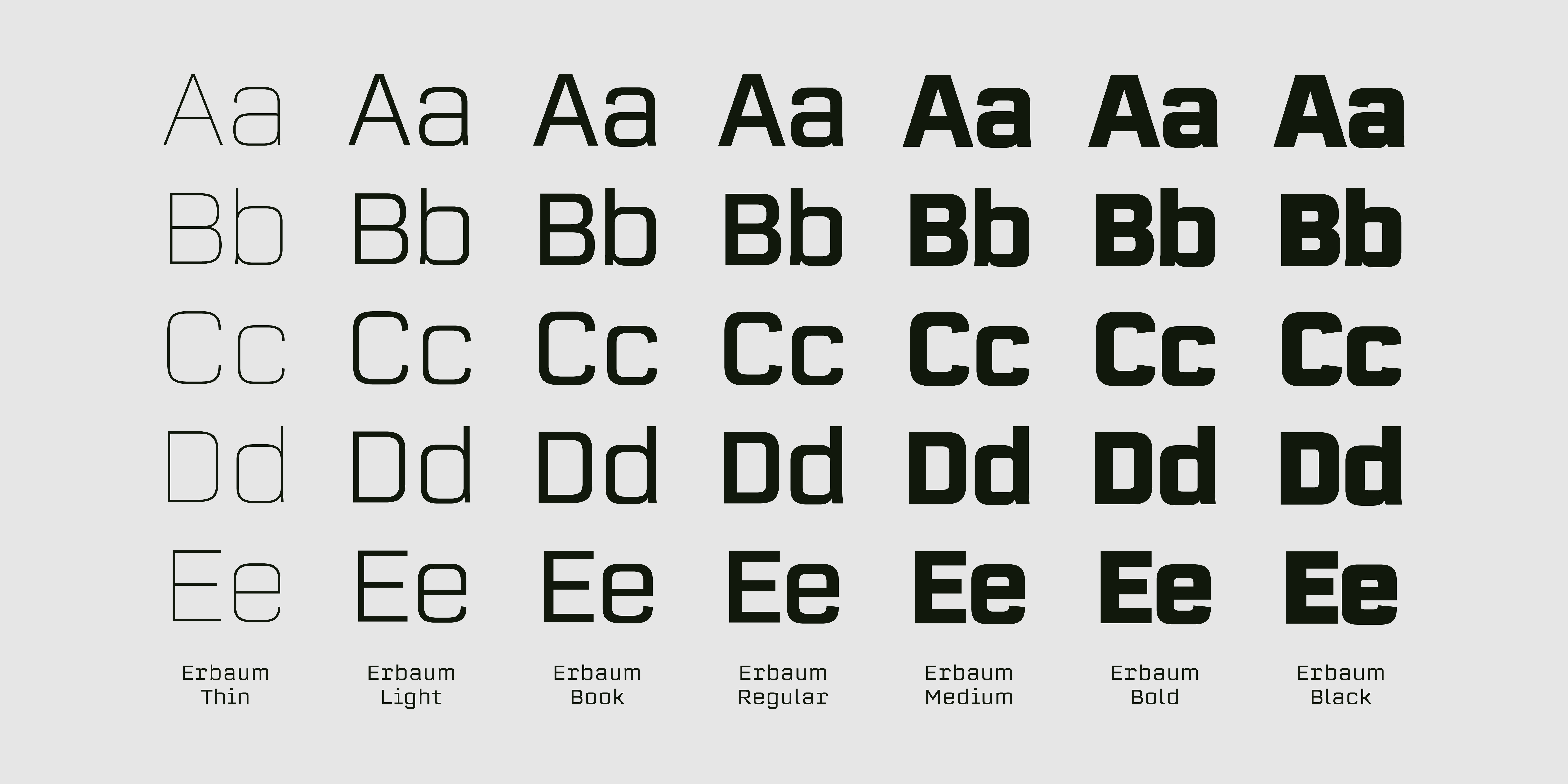 Erbaum is a display square sans serif type family. It is straight-forward in overall structure, simple and rational in details. Erbaum was designed to maximise clarity, with an emphasis on construction and pragmatic aesthetics. The concept behind this typeface was uncompromisingly function driven, which was to provide a clear and effective medium for communication and a modern alternative to similar fonts in the aforementioned category. Extended x-height and sharp details aid legibility. Other features include seven weights, Cyrillic, alternative characters and various OpenType features.