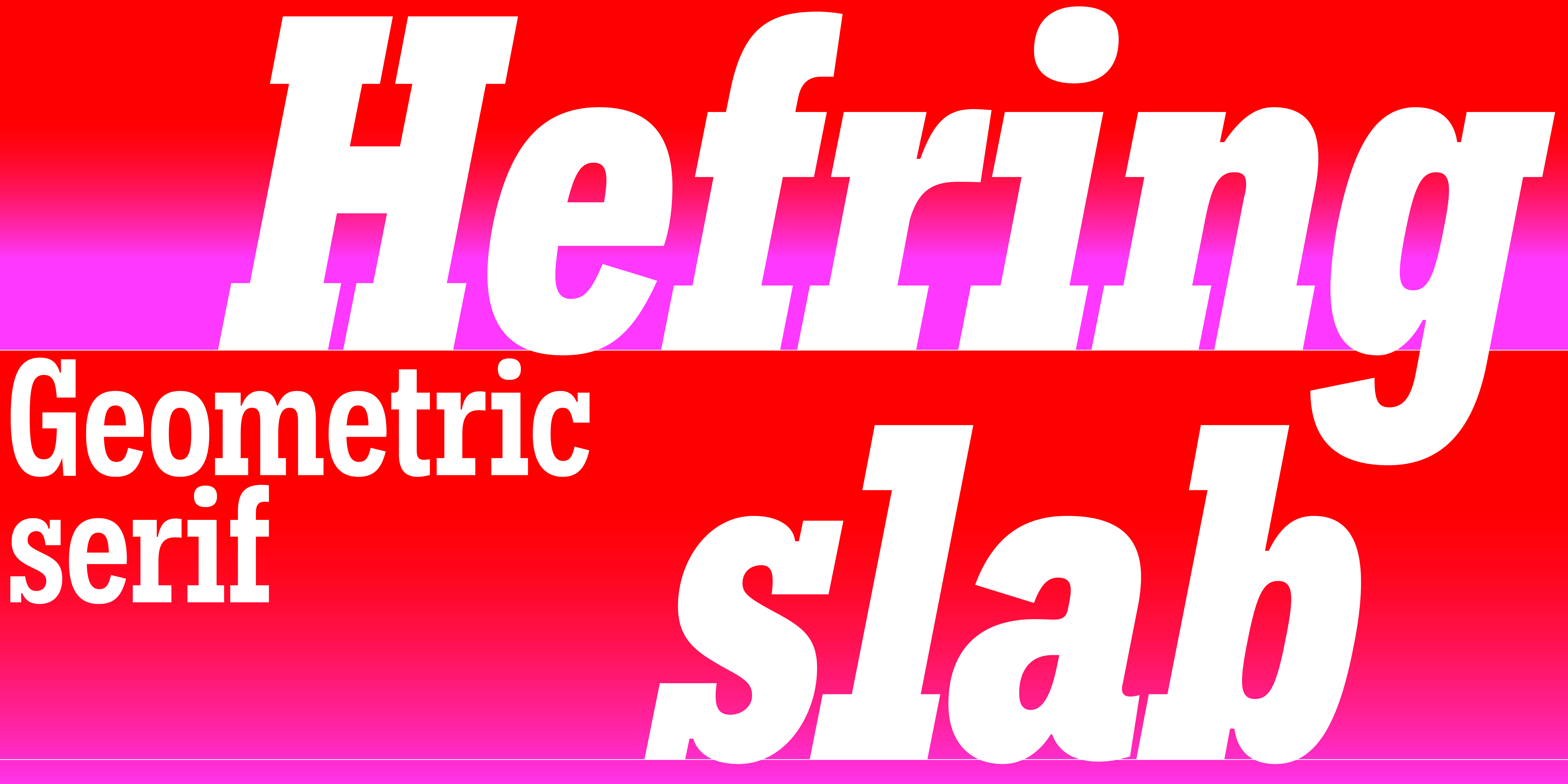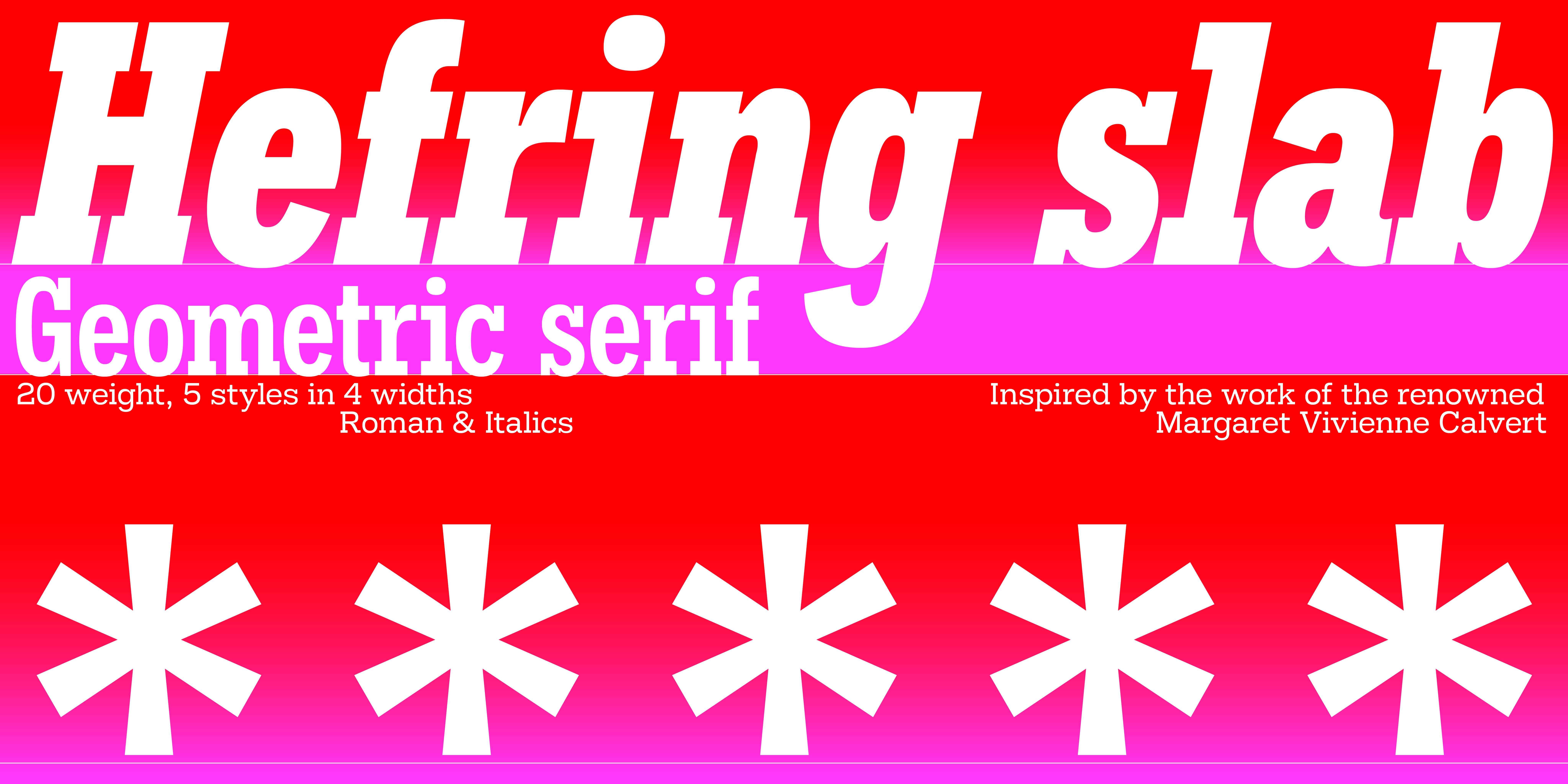 Hefring Slab is a geometric Slab Serif type family. Based on simple geometry, it has minimal stroke contrast, solid serif presence and a uniform thickness of strokes. The family consists of 20 fonts: 5 weights in 4 widths, each in Roman and Italic. Inspired by the work of the renowned Margaret Vivienne Calvert, Hefring Slab is robust, clear and functional. Opentype features include alternative characters, arrows, tabular figures, ligatures and fractions.