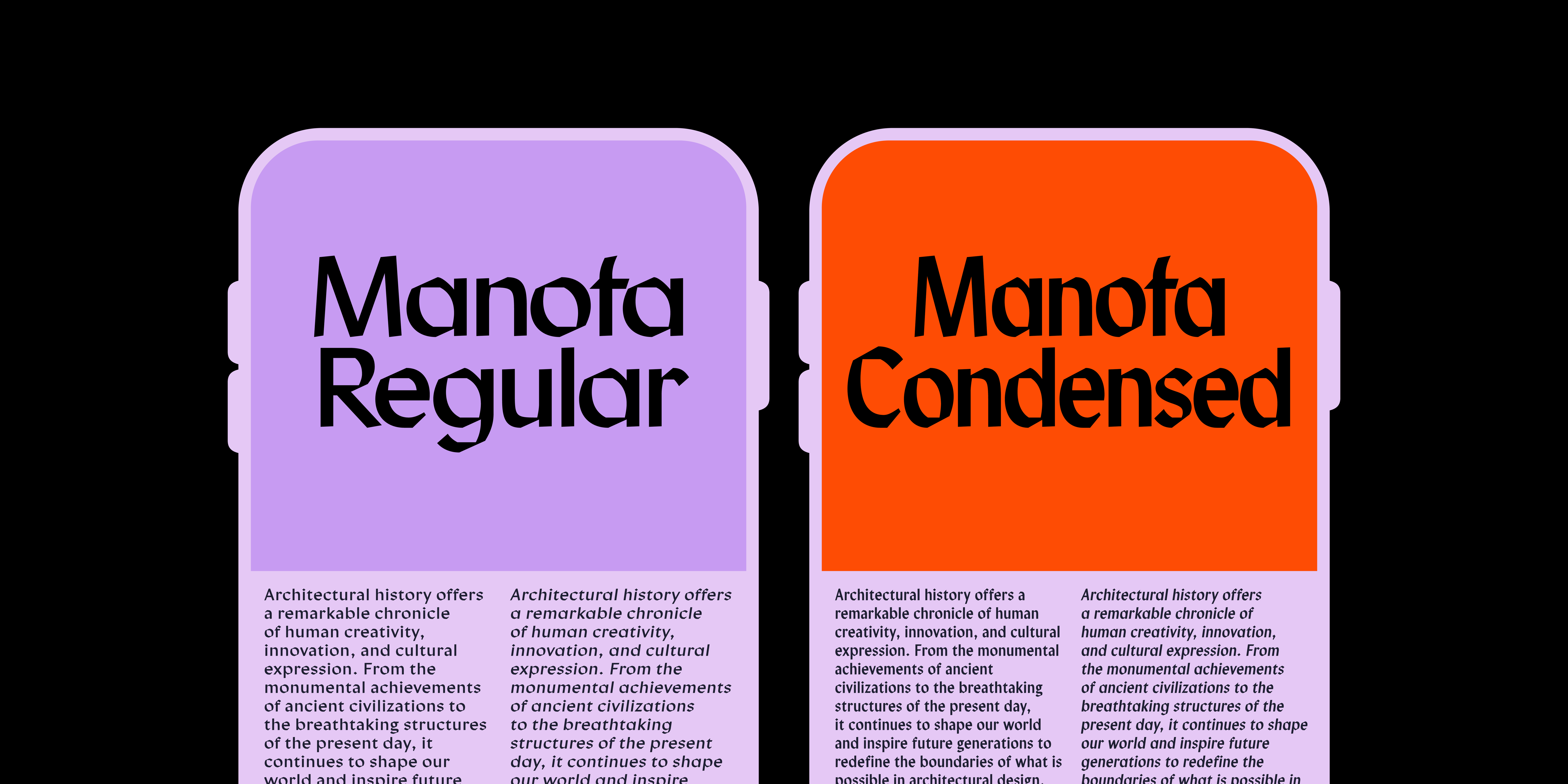 Manofa is a calligraphic sans-serif typeface. It is inspired by Warren Chappell's Lydian and originated from the experiments with the shape and form of the letter "O". The result is a contemporary, sharp and sculptural display. Details include four weights, matching italics, two widths, alternative characters and the OpenType features.