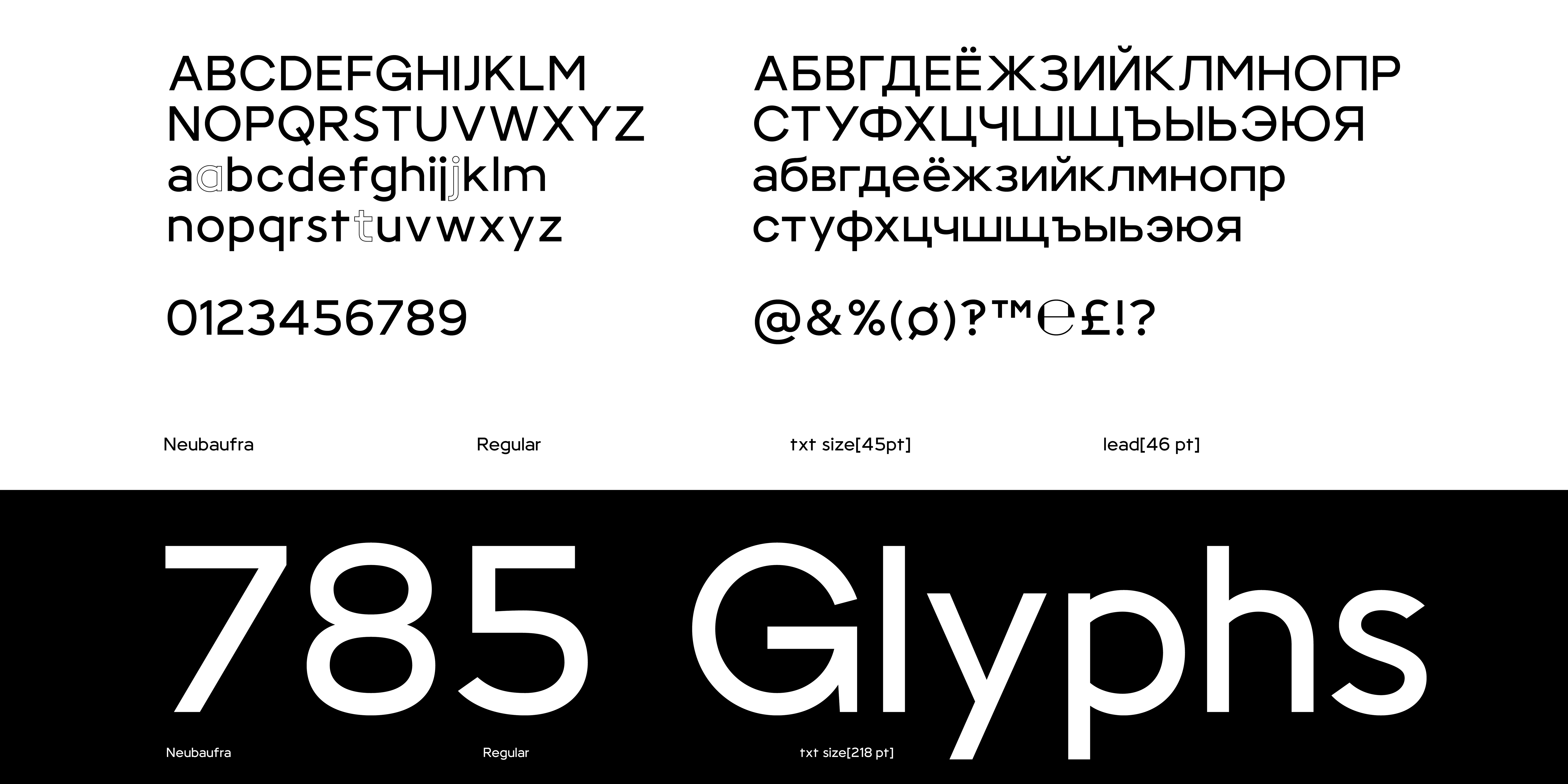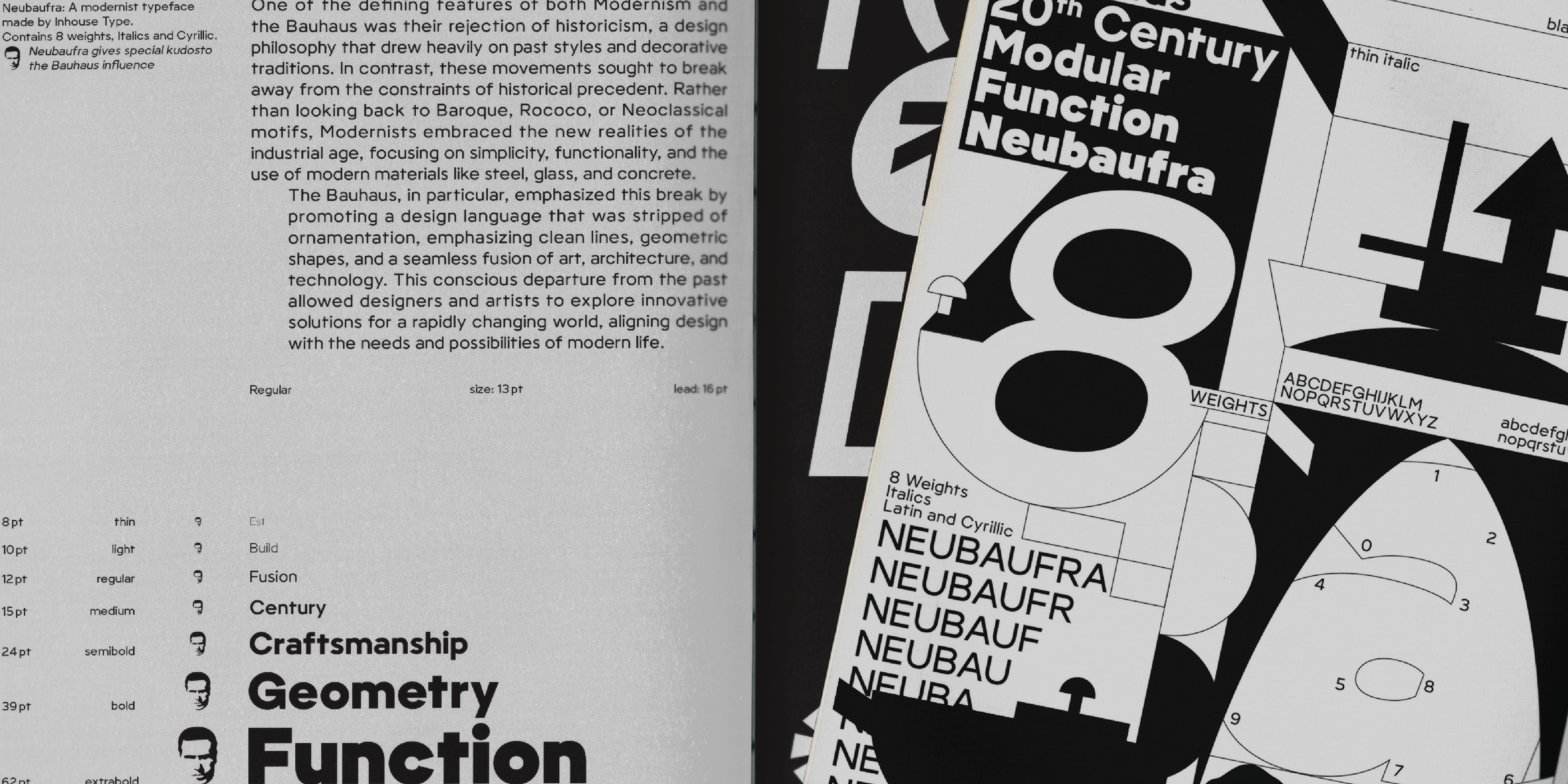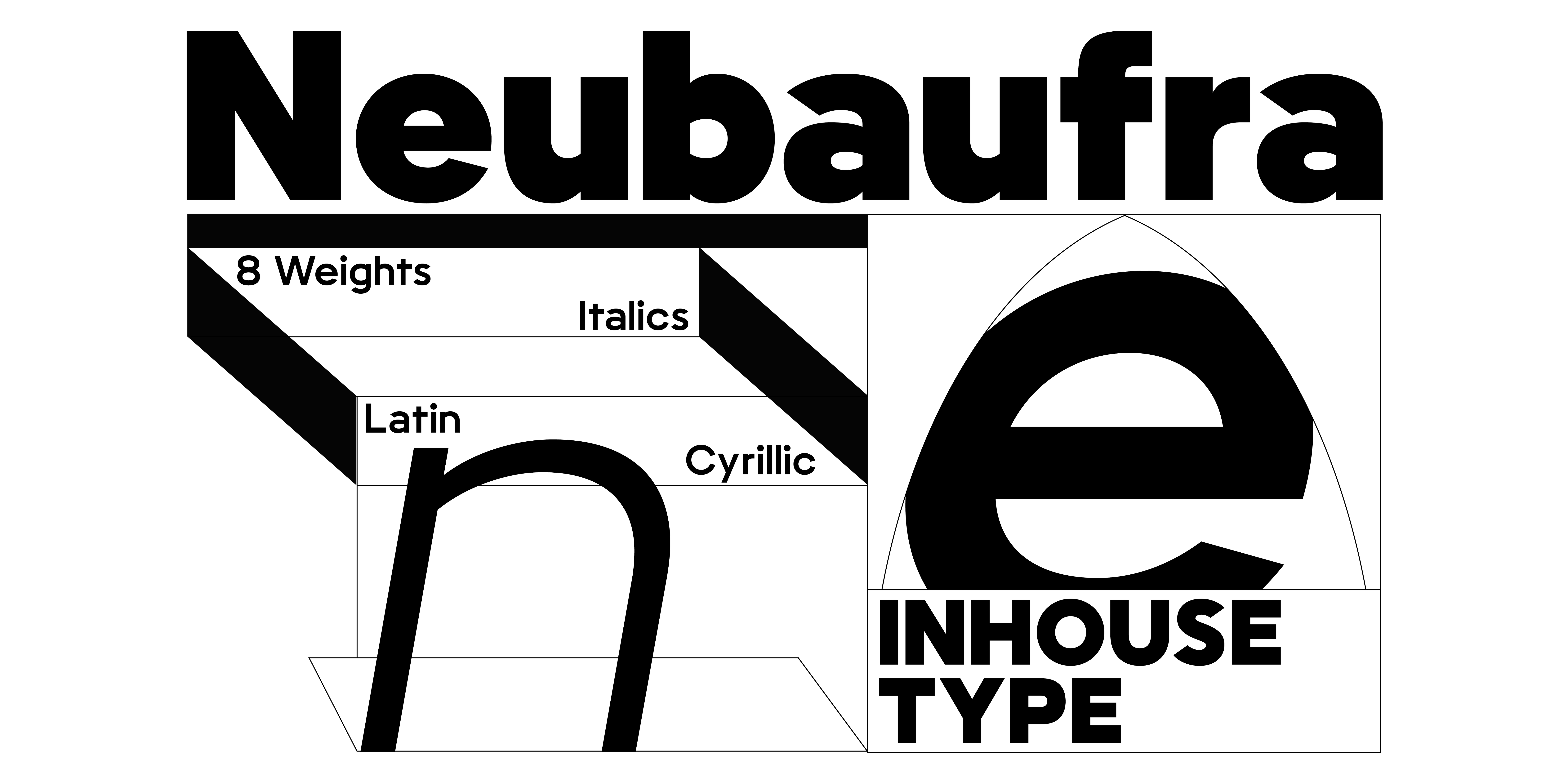 Neubaufra is a geometric modernist type family. Originally released in 2012 as Baufra, Neubaufra is a considerate restoration of the original work. Inspired by the early 20th century designs, Neubaufra gives special kudos to the Bauhaus influence. Complete with 8 weights + Italics, new design retained its prime modernist characteristics with the improvement to the legibility for text and web use. Extended language support includes Latin and Cyrillic.