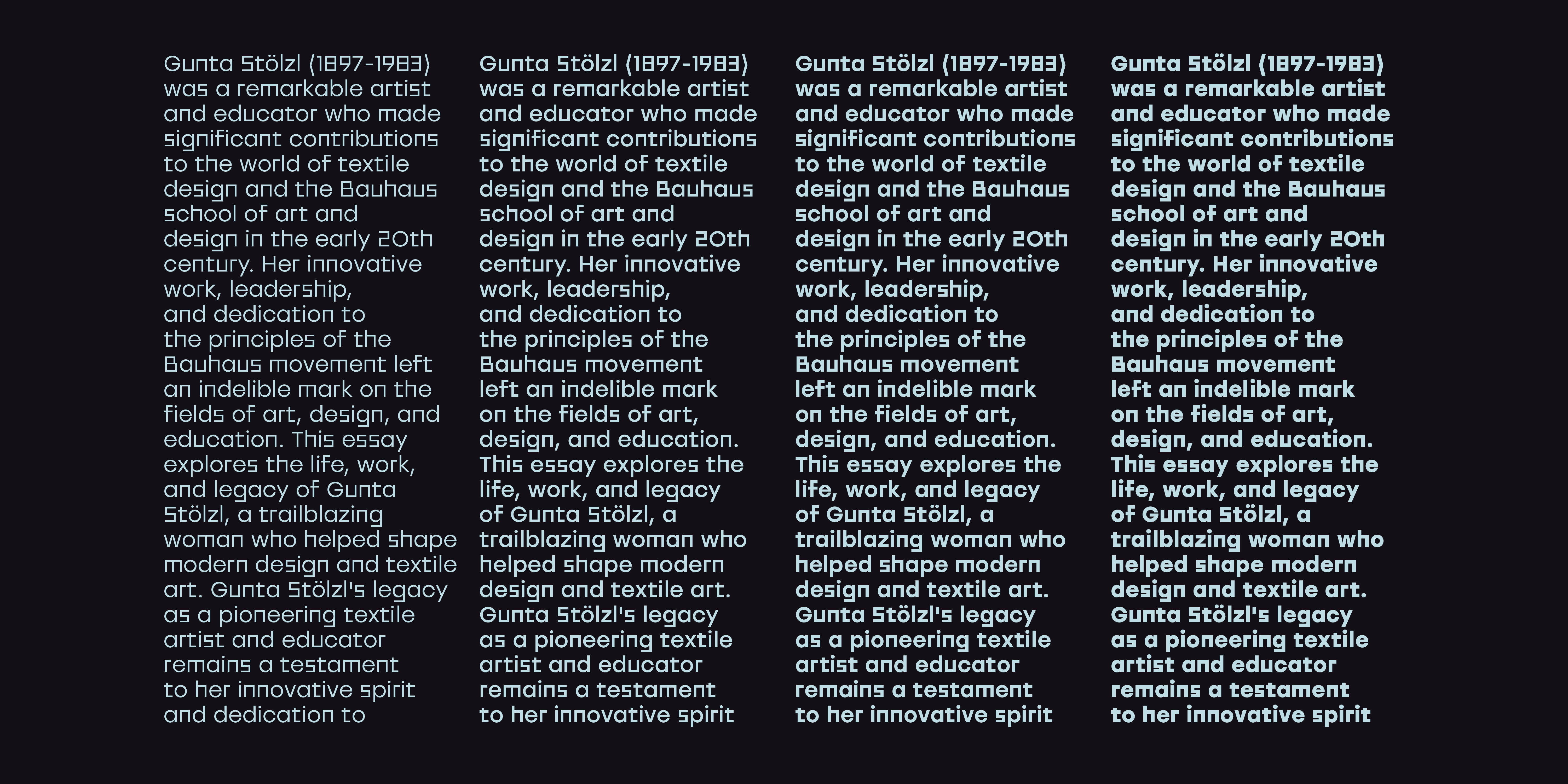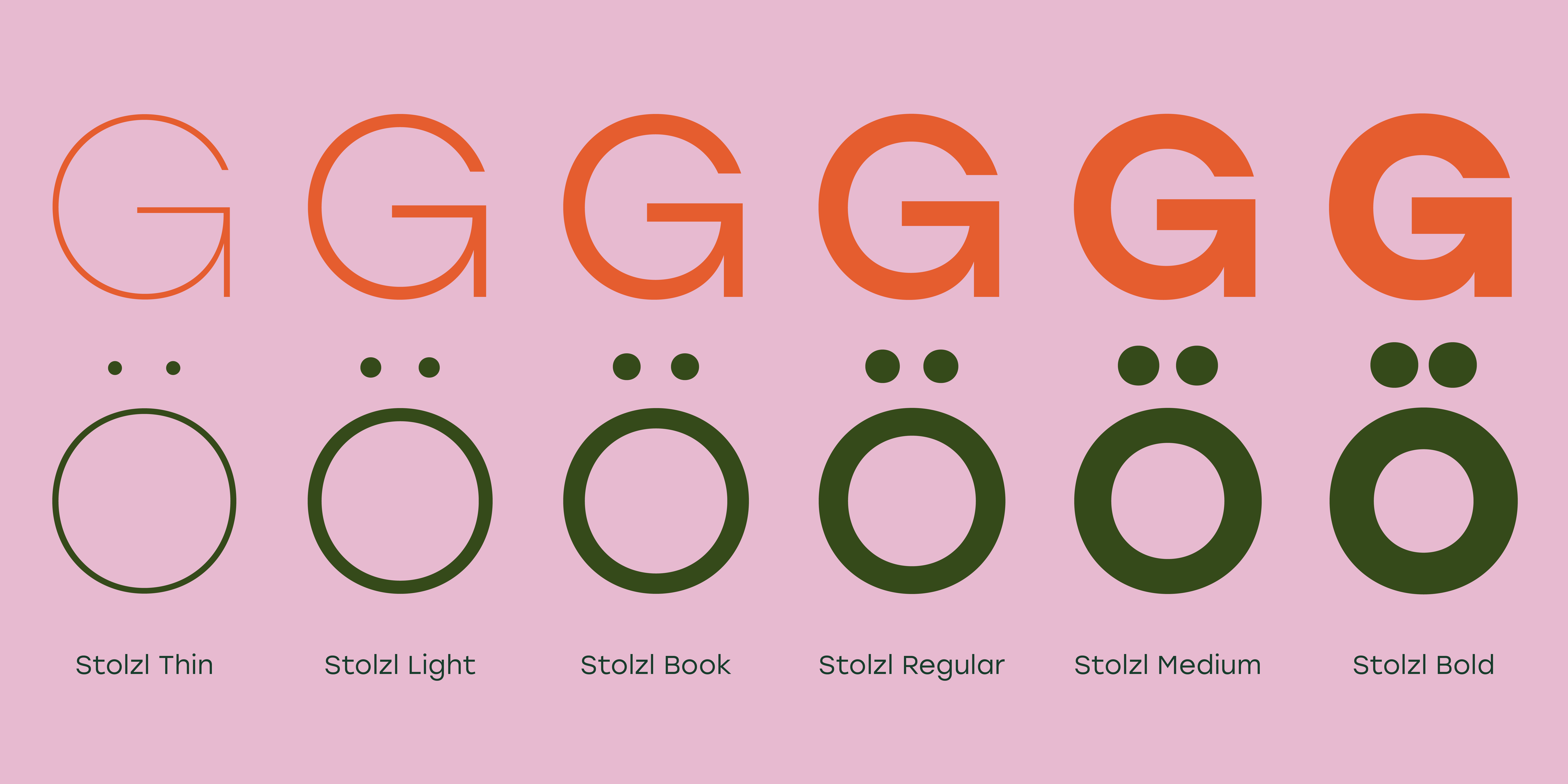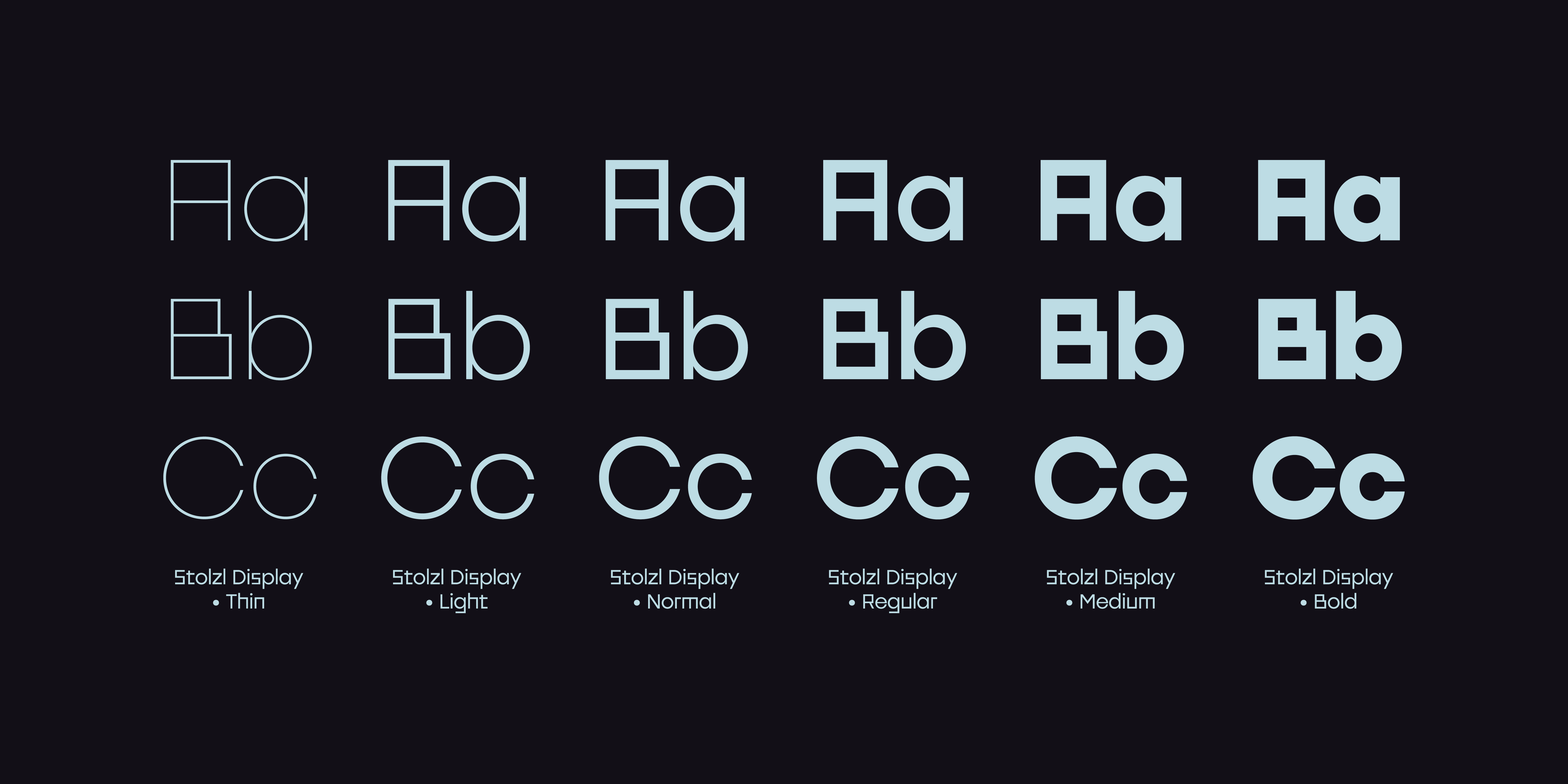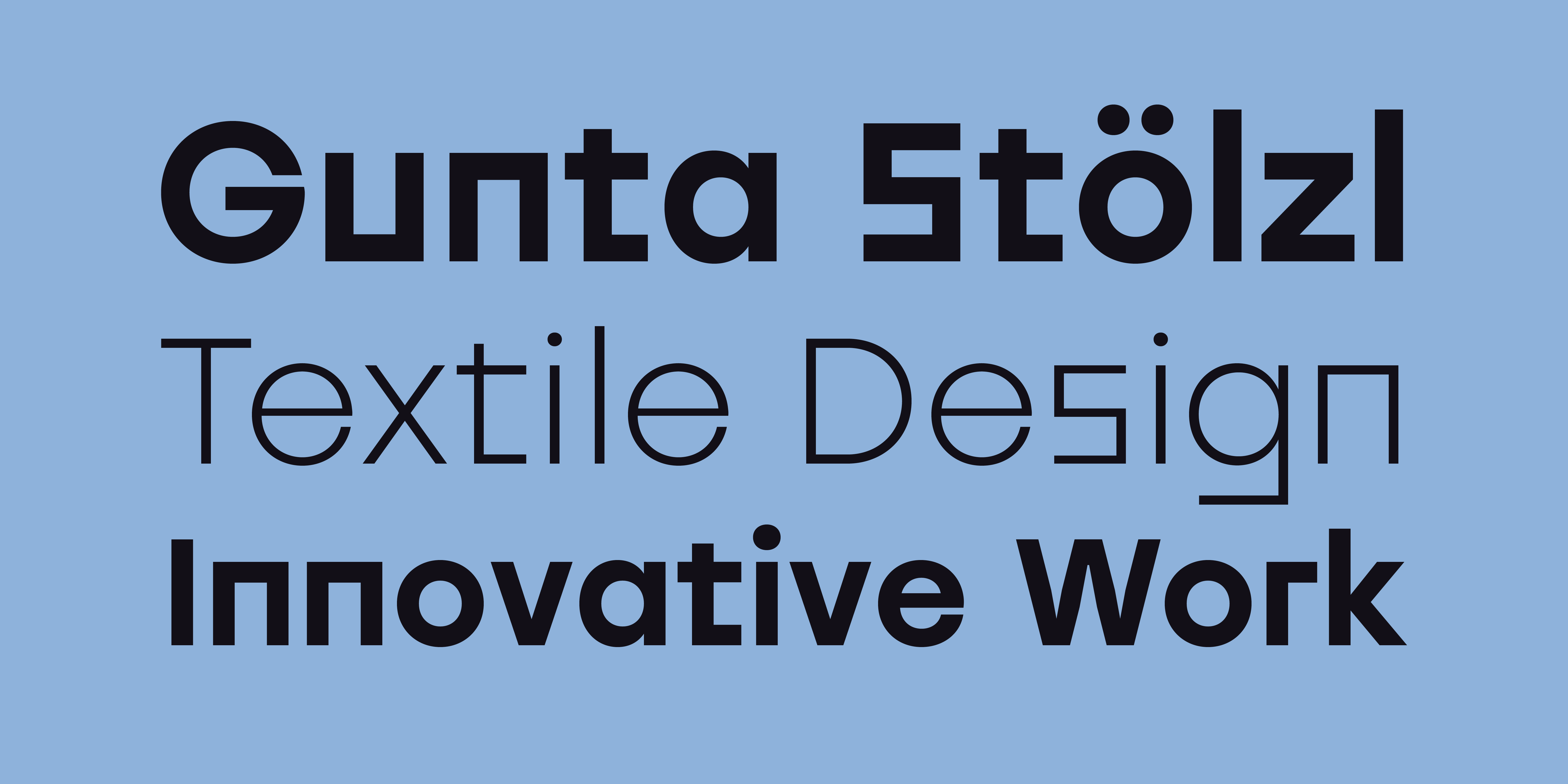 Stolzl Display is an original font family designed for headlines, titles and subtitles. Based on the combination of contrasting shapes, the harmony of form and rhythm is fundamental to the design. Inspired by Bauhaus, Stolzl represents, not just the significant influence of this “crucible of modernism”, but aims at capturing its original idealism, commitment to creativity and experiment driven philosophy. Details include six weights, Cyrillic, 480 characters, alternative glyphs, manually edited kerning and Opentype features. Named after Gunta Stölzl, the Bauhaus’s only female master, Stolzl Display was the first subfamily of the Stolzl font collection to be released.