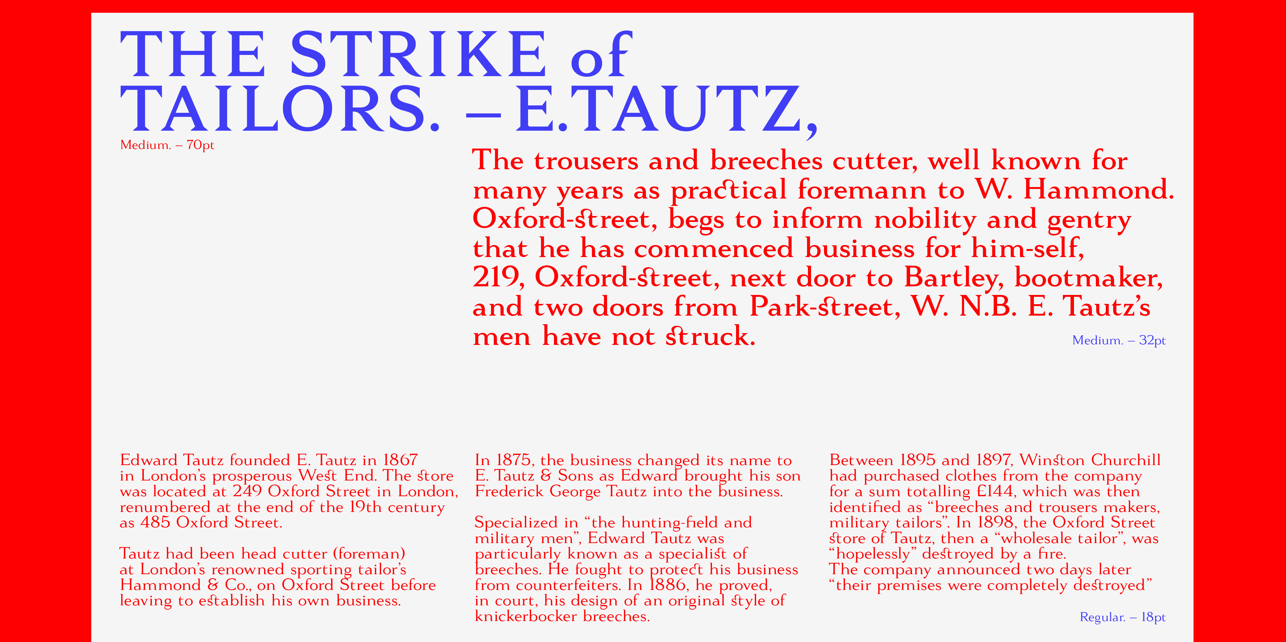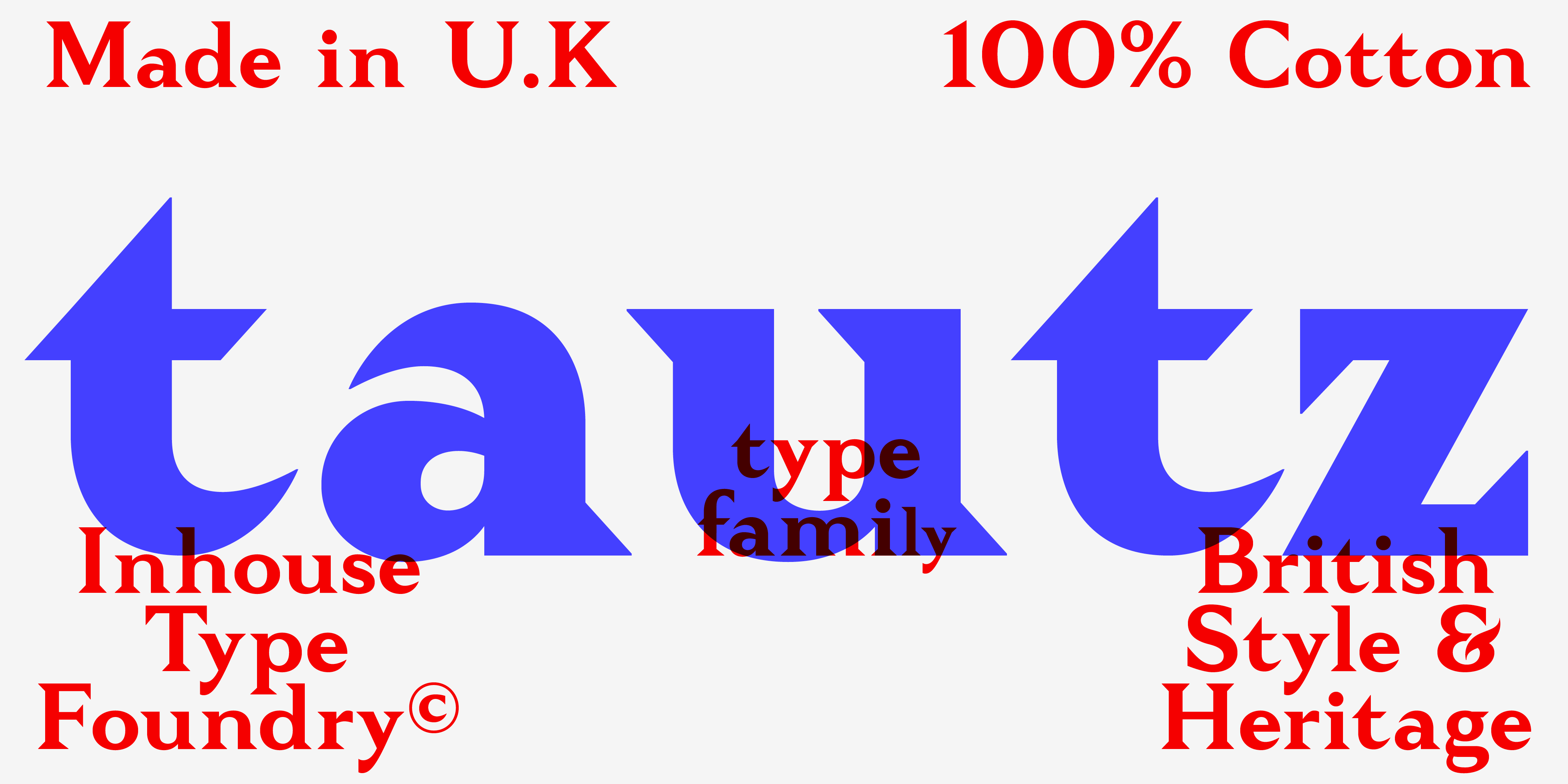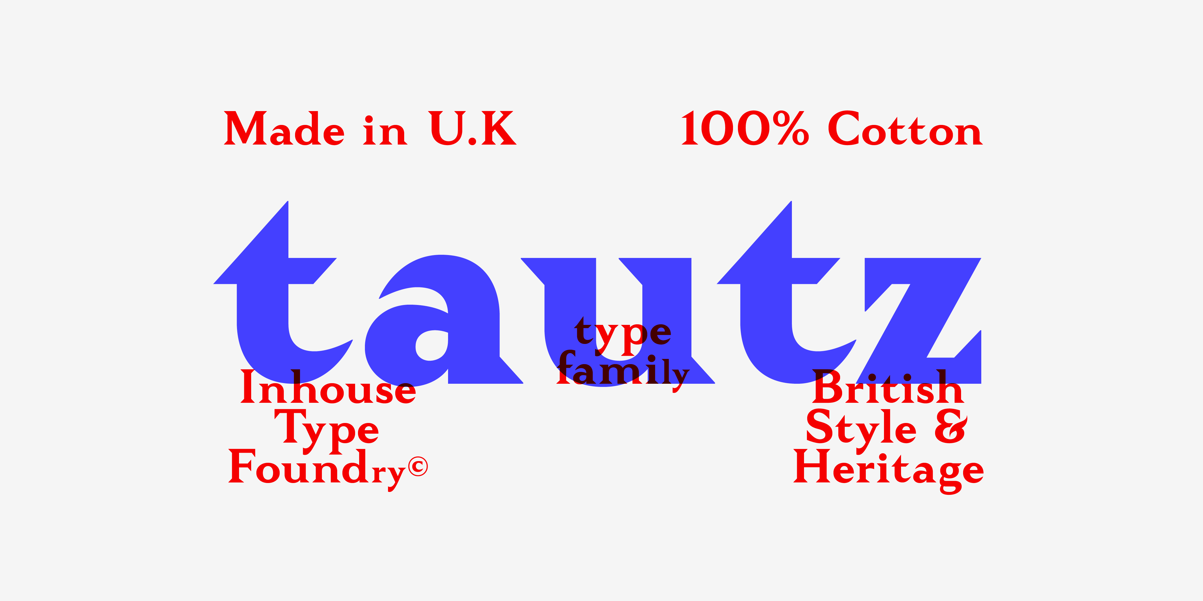 A concept driven serif font family of 5 weights. It is a contemporary take on the humanist serif with a touch of rationality and frivolity. Tautz began its life as a research into collective British Style & Heritage, as the pursuit of capturing “Britishness” without falling into the trap of stereotyping. Tautz is a personal reflection of this concept, resulting in a functional & characterful font family. Tautz features lowered x-height with an intention to create tension and resistance on the page or screen for that matter. This counteracts the geometric approach to the glyph construction and the sharpness of serif details. Resulting in a unique typeface that is suitable for text & display. Details include 5 weights, over 470 characters including Cyrillic, ligatures, manually edited kerning and Opentype features.